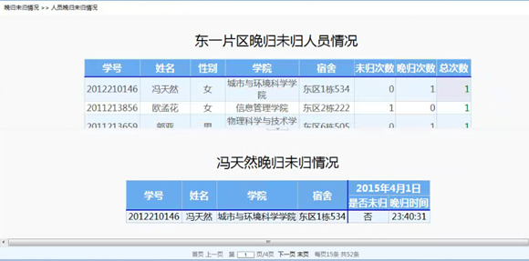 通過時間參數(shù)段內(nèi)的未歸人次、晚歸人次、男女異常率指標展示。