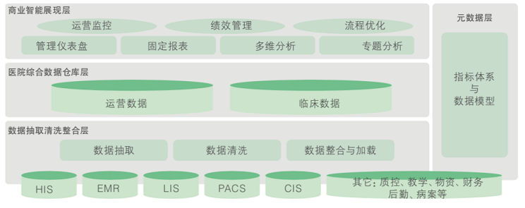 2)信息系統(tǒng)的各個(gè)子系統(tǒng)上線于不同的時(shí)期,時(shí)間跨度比較大,雖然有協(xié)作,但需要梳理。醫(yī)院現(xiàn)有的查詢、統(tǒng)計(jì)數(shù)據(jù)來源于各個(gè)業(yè)務(wù)系統(tǒng)中各自的報(bào)表,醫(yī)院難以及時(shí)掌控運(yùn)營(yíng)全貌,且還存在手工進(jìn)行一些報(bào)表的加工,比如計(jì)算、合并等,拖延了決策周期。