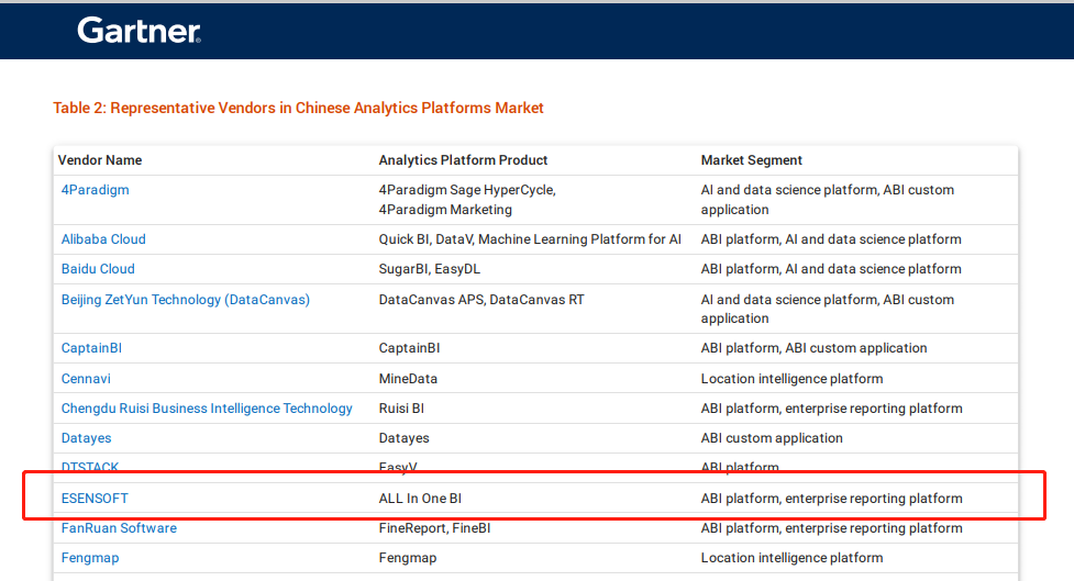 近日,國際權(quán)威研究與咨詢機構(gòu)Gartner發(fā)布2022年《中國分析平臺市場指南》(《Market Guide for Analytics Platforms, China》)。億信華辰入選“代表性廠商”,億信ABI作為代表性產(chǎn)品上榜。