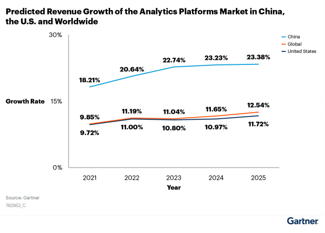 報告指出:中國分析平臺市場規(guī)模將持續(xù)增長。在數(shù)字化轉(zhuǎn)型趨勢、自助服務(wù)、增強分析以及商業(yè)智能解決方案的推動下,到2023年,整體分析采用率將從35%增加到50%。預(yù)計到2025年,中國分析平臺市場規(guī)模將達到16億美元,市場增長率將由18.21%提升到23.38%,是全球(12.54%)和美國(11.72%)市場預(yù)期增長的兩倍左右。