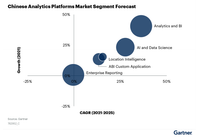 數(shù)據(jù)分析平臺的能力做了進一步的定義,包括了:企業(yè)報告平臺、ABI平臺、AI和數(shù)據(jù)科學(xué)平臺、ABI定制化應(yīng)用和位置智能平臺等方向。而在這些細分市場中,增長最快的領(lǐng)域是ABI平臺、AI和數(shù)據(jù)科學(xué)平臺,預(yù)計復(fù)合年增長率分別為36.23%和27.72%。
