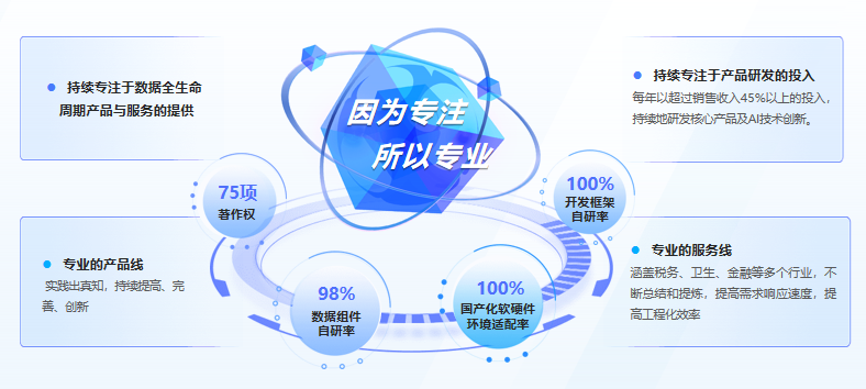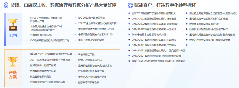 億信ABI與睿治數據治理平臺。憑借創新、易用、強大的特性,產品自發布以來持續領先于同時代其他產品,受到客戶廣泛認可,打造出多個數字化轉型標桿,并拿下眾多殊榮:多次入選Gartner《中國分析平臺市場指南》代表廠商,三度斬獲DAMA數據治理優秀產品獎,蟬聯IDC中國數據治理解決方案市場第一……