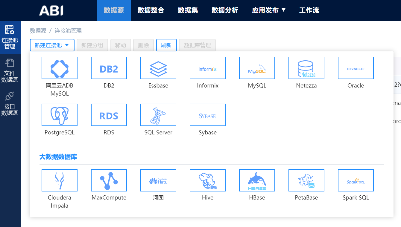 億信ABI支持對接包括:Mysql、Oracle、SQL Server、DB2、GBase、PetaBase、Essbase等多種數據庫,而且還支持各種其他類型文件的導入數據,包括excel、txt、csv、db等等文件。