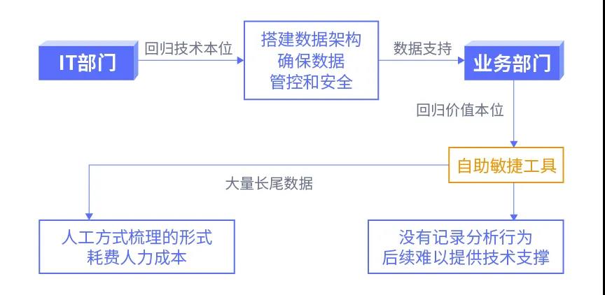 敏捷BI對于長尾數據難以有效處理,同時分析經驗和知識體系難以進行沉淀,IT部門很難在后續為其提供技術支撐,使其也有一定的局限性。