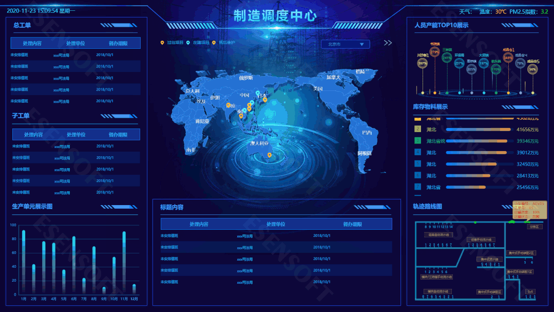 —TOP 4— 制度調(diào)度大屏 最佳分辨率:1920*1080 使用場(chǎng)景:工業(yè)4.0時(shí)代,制造業(yè)也開(kāi)始積極響應(yīng)產(chǎn)業(yè)數(shù)字化的號(hào)召,融合大數(shù)據(jù)分析、3D地圖等技術(shù),構(gòu)建體系先進(jìn)、功能強(qiáng)大、場(chǎng)景豐富的制造調(diào)度指揮系統(tǒng),滿足了生產(chǎn)調(diào)度、應(yīng)急指揮、遠(yuǎn)程指揮、綜合決策以及企業(yè)宣傳等多種應(yīng)用場(chǎng)合。 展現(xiàn)邏輯:通過(guò)世界地圖一覽在建及歷史項(xiàng)目的運(yùn)轉(zhuǎn)狀態(tài),方便售后維護(hù);另外對(duì)于制造中心內(nèi)的總工單、子工單、物料消耗、人員產(chǎn)能等指標(biāo)進(jìn)行充分直觀地展現(xiàn)。