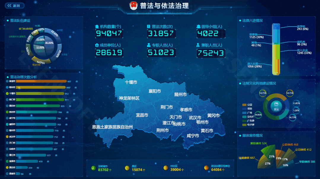 —TOP 2— 法制宣傳大屏 最佳分辨率:1920*1080 使用場(chǎng)景:了解普法工作的推進(jìn)情況,包括隊(duì)伍建設(shè)、媒體宣傳、各個(gè)縣市的大數(shù)據(jù)對(duì)比等,對(duì)于有法制宣傳,法律服務(wù)等需求的行業(yè)提供大屏承載方案,助其成為暢通社情民意、服務(wù)保障民生的監(jiān)管新陣地。 展現(xiàn)邏輯:使用樣式各異的圖表,展示法律行業(yè)內(nèi)的不同需求的數(shù)據(jù),根據(jù)地理位置等信息數(shù)據(jù),直觀、便捷的展現(xiàn)數(shù)據(jù)結(jié)果,讓人一目了然。