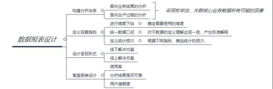 維度細(xì)化的過(guò)程中,可能會(huì)逐漸拆分為一級(jí)指標(biāo)、二級(jí)指標(biāo)……n級(jí)指標(biāo),但并非拆分中的每一個(gè)維度都要作為觀察指標(biāo)。是否作為報(bào)表使用要結(jié)合公司業(yè)務(wù)特點(diǎn)并且和業(yè)務(wù)部門多次溝通協(xié)調(diào)達(dá)成共識(shí)。
