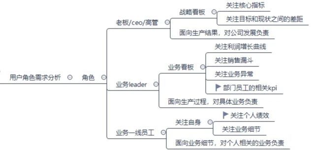 數(shù)據(jù)看板是公司內(nèi)所有人員都會(huì)關(guān)注的,無(wú)論是公司高層還是基層業(yè)務(wù)操作者都會(huì)關(guān)注相關(guān)的數(shù)據(jù)指標(biāo)。只是不同的角色的需求不同,如下圖:
