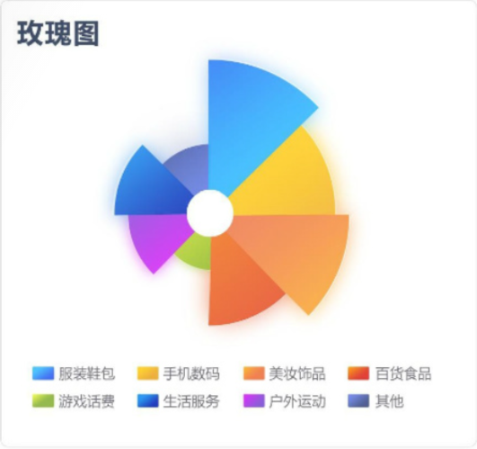 餅圖 一般通過顏色區(qū)分類別,幅度的大小對比數(shù)據(jù),并且可以展示各類別與整體之間的占比關(guān)系。